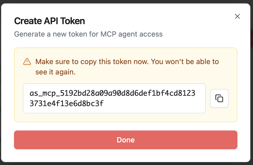 Your token starts with as_mcp_, keep it somewhere safe before moving to the next step.